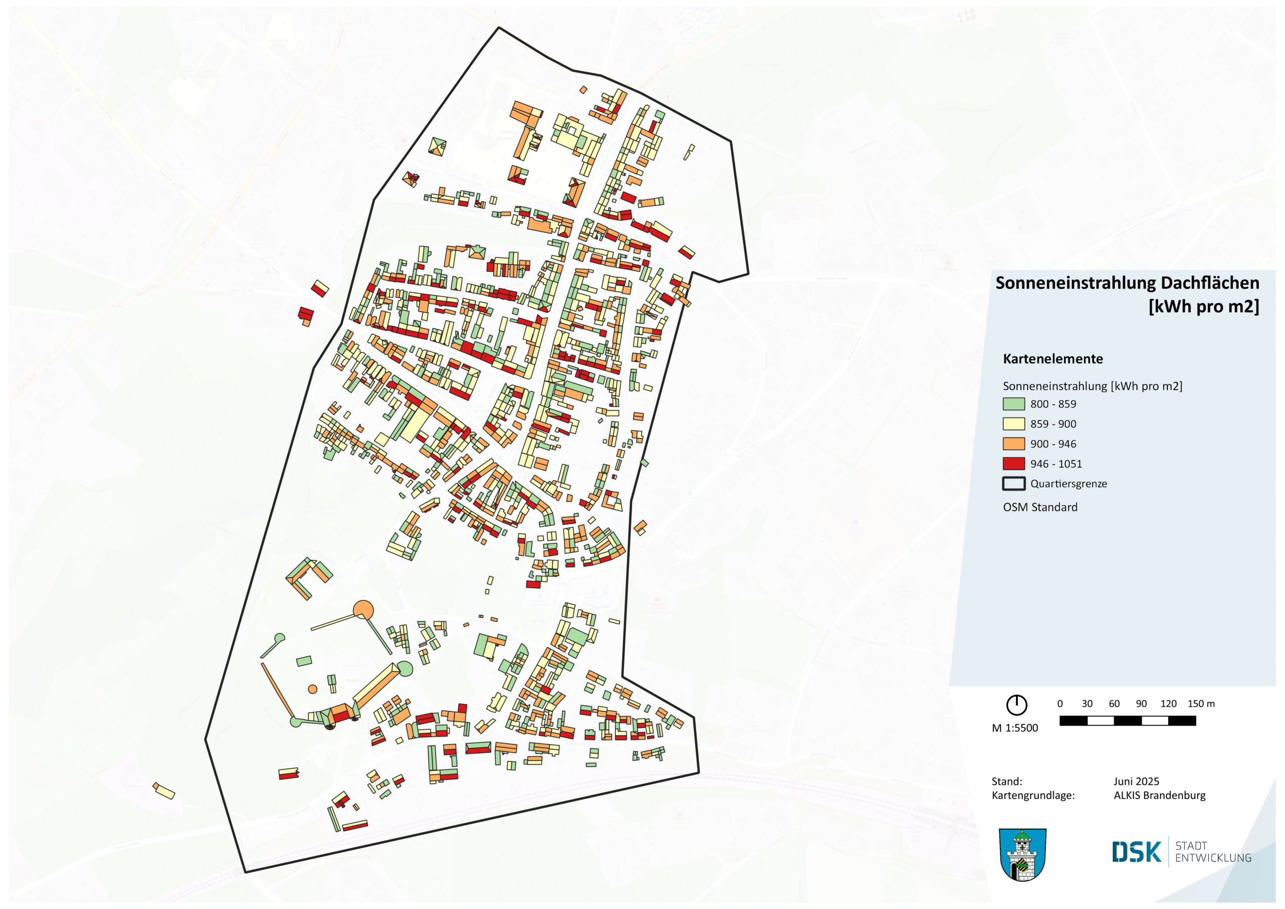 Die Karte gibt Ihnen eine Orientierung über die Sonneneinstrahlung in kWh / Jahr je Dachfläche zur Einschätzung, ob sie für das Anbringen von Solaranlagen geeignet sein könnten. Ebenfalls kann der Solaratlas den Landes Brandenburg genutzt werden: https://energieportal-brandenburg.de/cms/inhalte/tools/solaratlas-brandenburg/mein-dach