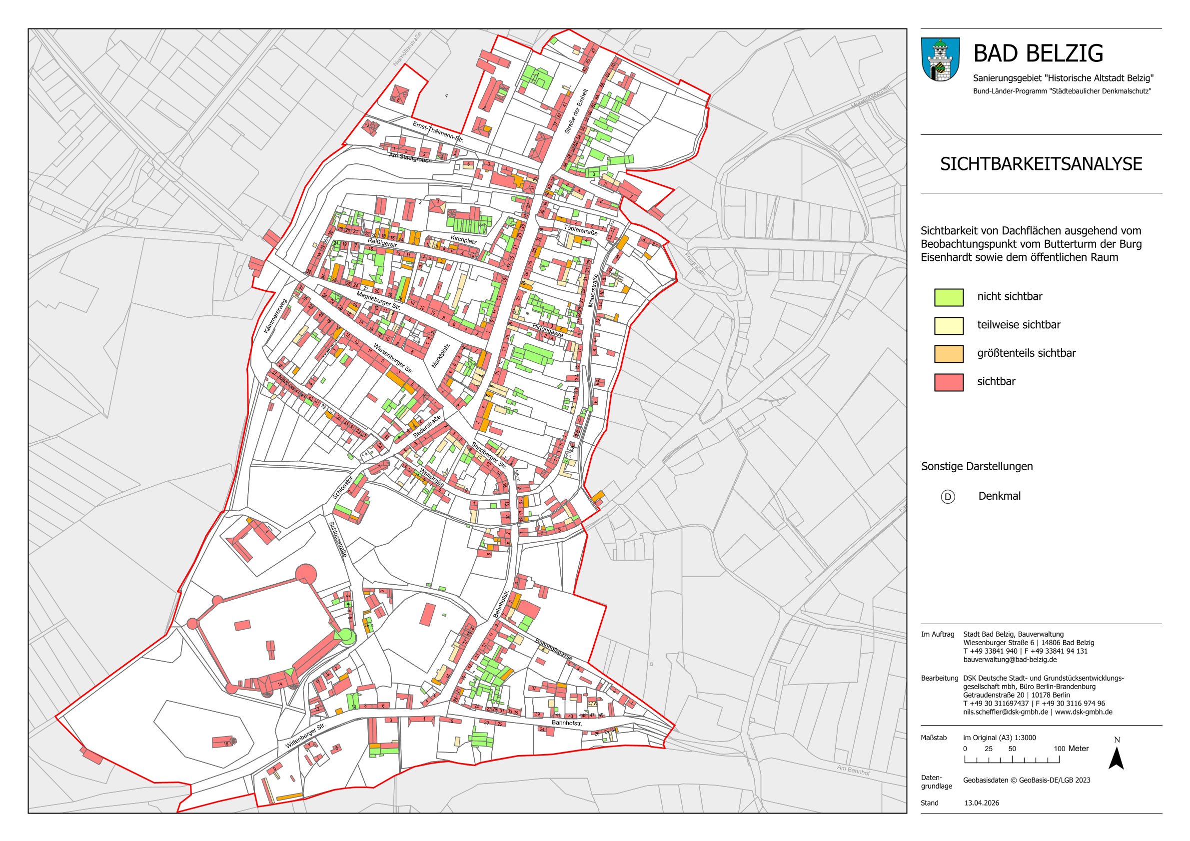 Die Karte gibt Ihnen eine Orientierung, welche Dachflächen im Altstadtbereich vom öffentlichen Raum sowie vom Butterturm der Burg Eisenhardt nicht, teilweise, größteils oder vollständig sichtbar sind. Dies ist z.B. relevant für das Anbringen von Solaranlagen, für die Sie gemäß der Gestaltungssatzung der Stadt Bad Belzig einer Genehmigung bedürfen.